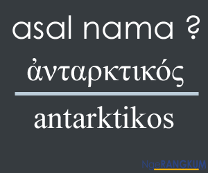 Ternyata, asal nama benua Antartika berasal dari Bahasa Yunani, yaitu ἀνταρκτικός “antarktikos”, lawan kata arktik atau anti-arktik (berlawanan dengan utara), yang berarti “lawan kata dari utara” atau “anti arctic”. Arctic atau Arktik adalah sebutan untuk kutub utara (yang berupa lautan tertutup es), sehingga Antartika dengan mudah diasosiasikan ke kutub selatan, yang kebetulan berbentuk daratan besar (benua) dan tertutup es.